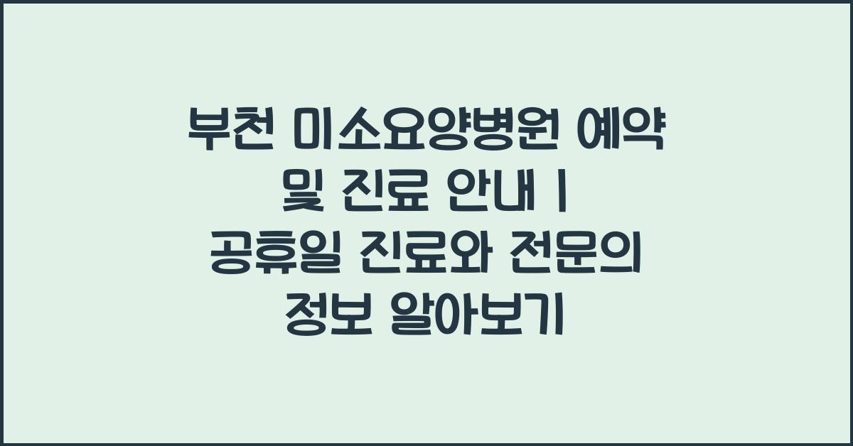 부천 미소요양병원 예약 및 진료 안내 | 공휴일 진료, 전문의 정보를 잘 활용하면 원하는 시간에 진료받는 것은 물론, 더욱 여유로운 병원 방문이 가능합니다. 그리고 혹시 예약에 문제가 있다면, 병원 직원에게 문의하여 해결할 수 있는 방법을 찾는 것도 좋은 방법입니다.