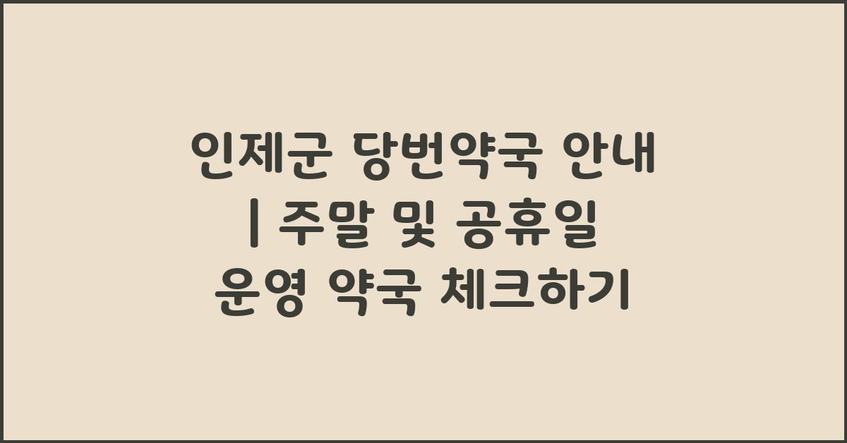 인제군의 주말 및 공휴일 운영 약국은 일정에 따라 다르지만, 기본적으로 많은 약국이 주말 동안에도 서비스를 제공합니다. 하지만, 평일과 다르게 운영 시간이 제한적이기 때문에 미리 정보 확인이 필수입니다. '인제군 당번약국 안내 | 주말 및 공휴일 운영 약국 체크하기'를 통해 구체적인 약국과 운영 시간을 확인하세요!