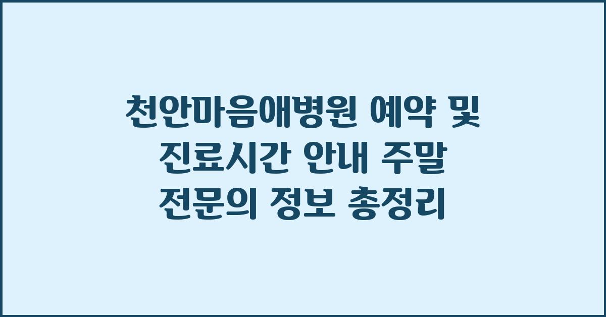 마지막으로 천안마음애병원의 진료시간과 예약 방법에 대해 간략히 정리해 드릴게요. 진료를 받기 위해서는 정확한 시간을 알고 방문하는 것이 중요합니다. 아래 정보는 꼭 확인해보시기 바랍니다!