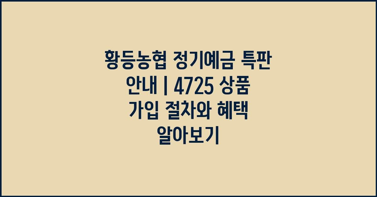 셋째, 가입 후 일정 기간 동안 자금을 예탁함으로써 안정적인 소득을 기대할 수 있습니다. 각종 세금에 따른 우대 혜택도 뒷받침돼 있어서, 투자 효과를 극대화할 수 있죠. 넷째, 상품 가입 후 특별한 이벤트나 추가 혜택에 참여할 수 있는 기회를 주기도 합니다. 즉, 매력적인 재정 파트너가 되어줄 황등농협의 정기예금 특판 안내 | 4725 상품에 대해 더 알아보는 게 낫겠죠?